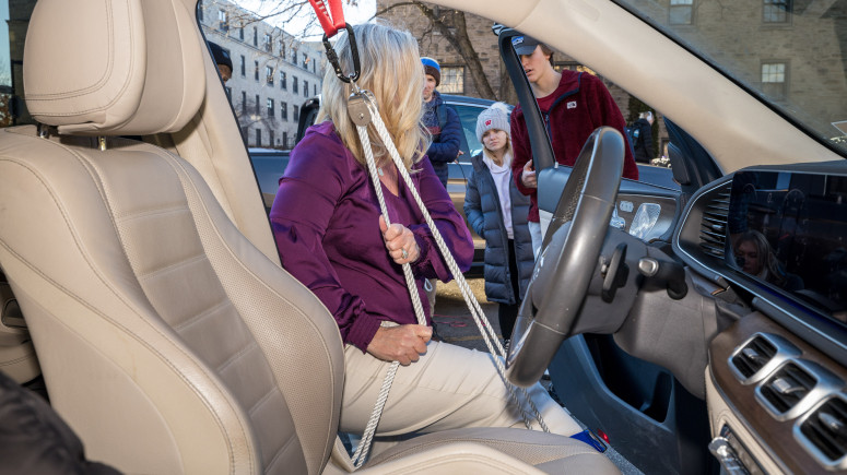 In the end, the students, with Collins’ endorsement, opted for the simplest and most adaptable design. Their pulley system consists of a foot loop, rope, pulley and carabiner. It won out over a collapsible seat that would slide toward the driver’s seat — à la a rowing machine — and a pneumatic balloon.